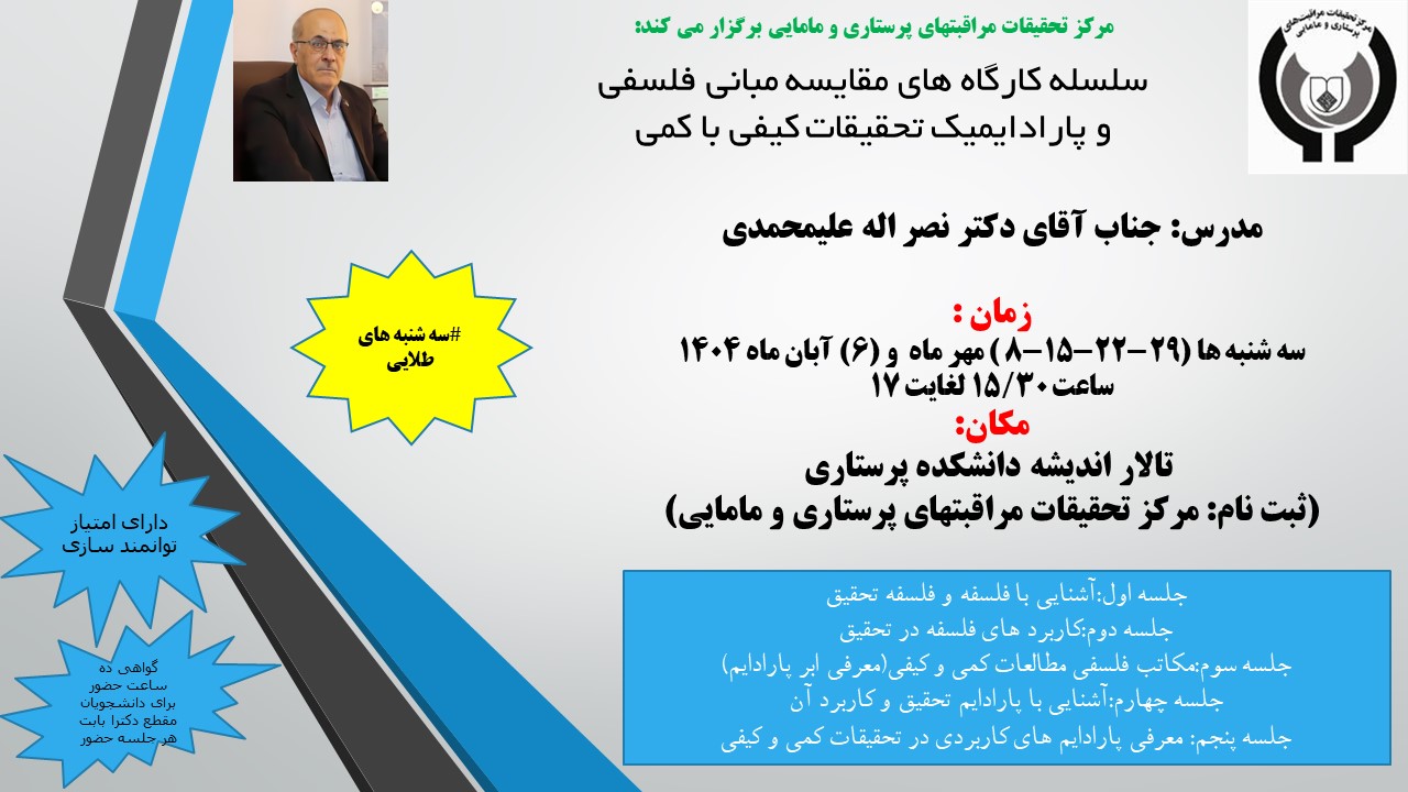پنجمین و آخرین سه شنبه طلایی در مرکز تحقیقات مراقبتهای پرستاری و مامایی برگزار شد. سه شنبه های طلایی عنوانی است که در آن سلسله کارگاههای پژوهشی توسط مرکز تحقیقات مراقبتهای پرستاری و مامایی از ابتدای مهر ماه 1404 آغاز شده است. در پنجمین سه شنبه طلایی که در تاریخ ششم آبانماه برگزار شد از سلسله کارگاههای آشنایی با فلسفه و پارادایم تحقیقات کیفی رونمایی شد. این کارگاه که با استقبال بسیار خوب اساتید و دانشجویان تحصیلات تکمیلی روبرو شد در تالار اندیشه دانشکده پرستاری و مامایی برگزار گردید