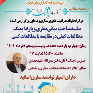 مرکز تحقیقات مراقبتهای پرستاری و مامایی ضمن تبریک فرا رسیدن آذرماه پژوهش در ادامه #سه شنبه- طلایی های خود که عنوانی است که در آن سلسله کارگاههای پژوهشی از ابتدای مهر ماه 1404 برگزار می کند، این بار این سلسله کارگاهها با موضوع مبانی نظری و پارادایمیک مطالعات کیفی در مقایسه با مطالعات کمی در تالار اندیشه دانشکده پرستاری و مامایی در روز های سه شنبه از ساعت 15/30برگزار خواهد کرد.لذا از کلیه علاقمندان و اساتید محترم دعوت می کند در این برنامه پژوهشی شرکت نمایند